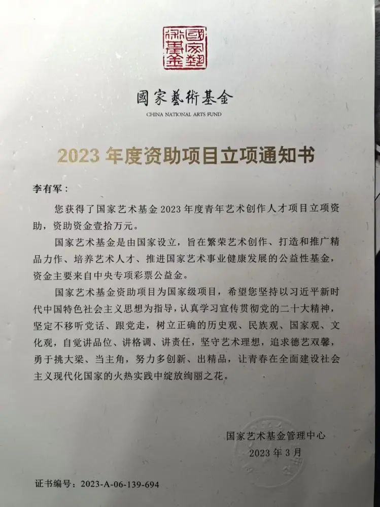 1.李有军:获批2023年度国家艺术基金青年艺术创作人才资助项目,项目名称:《陕甘宁边区民众剧团的艺术道路及其启示》,批准号:2023-A-06-139-694。