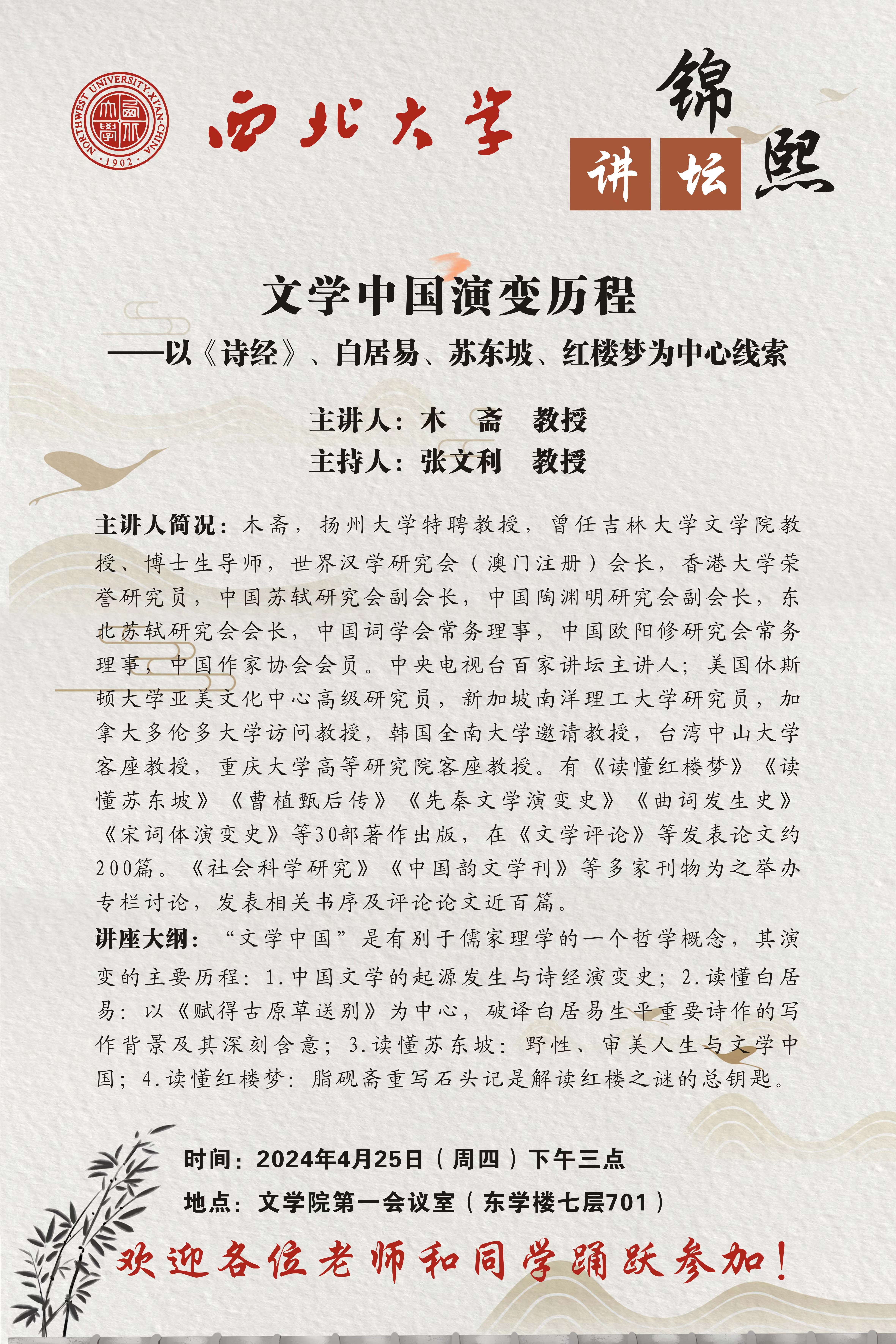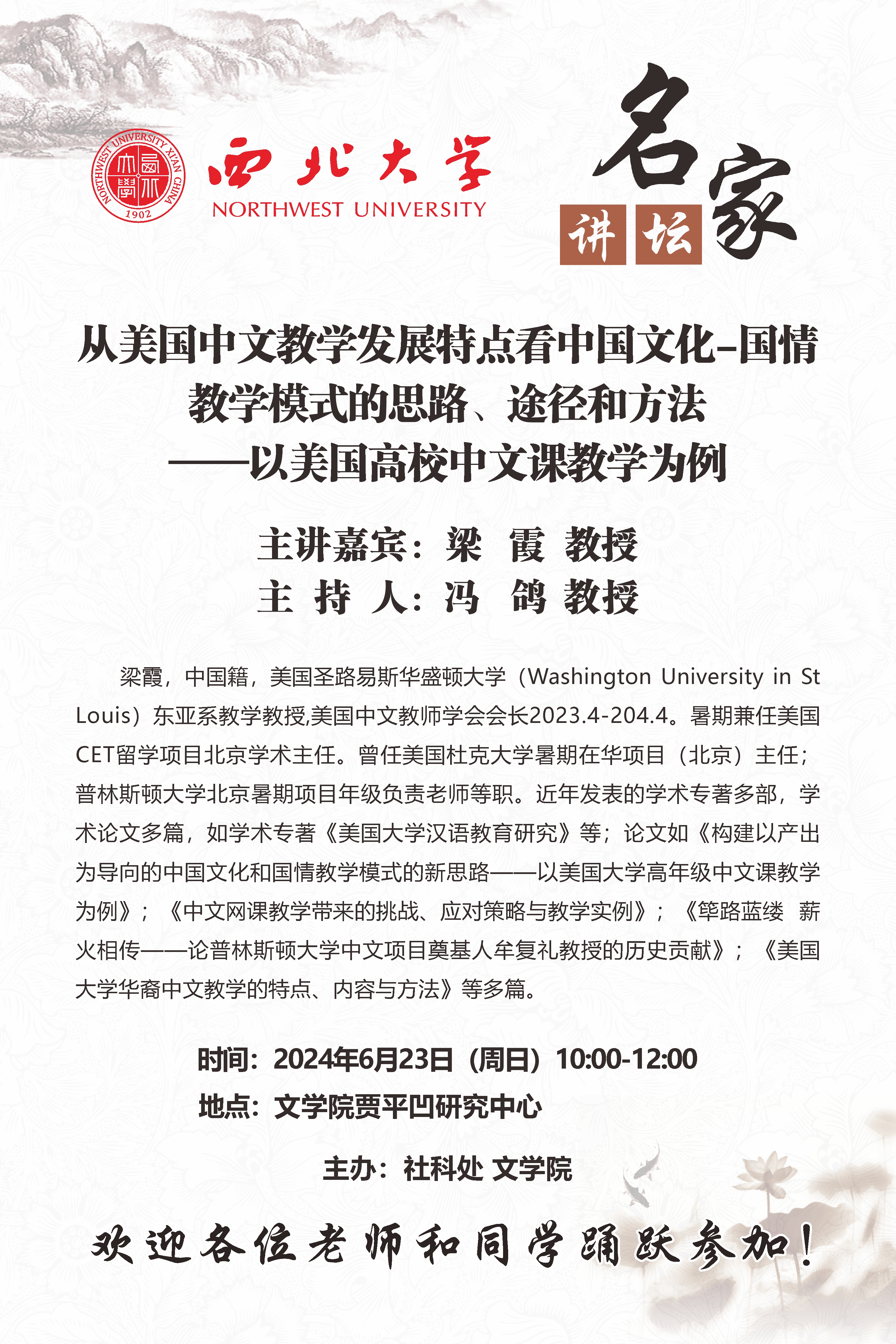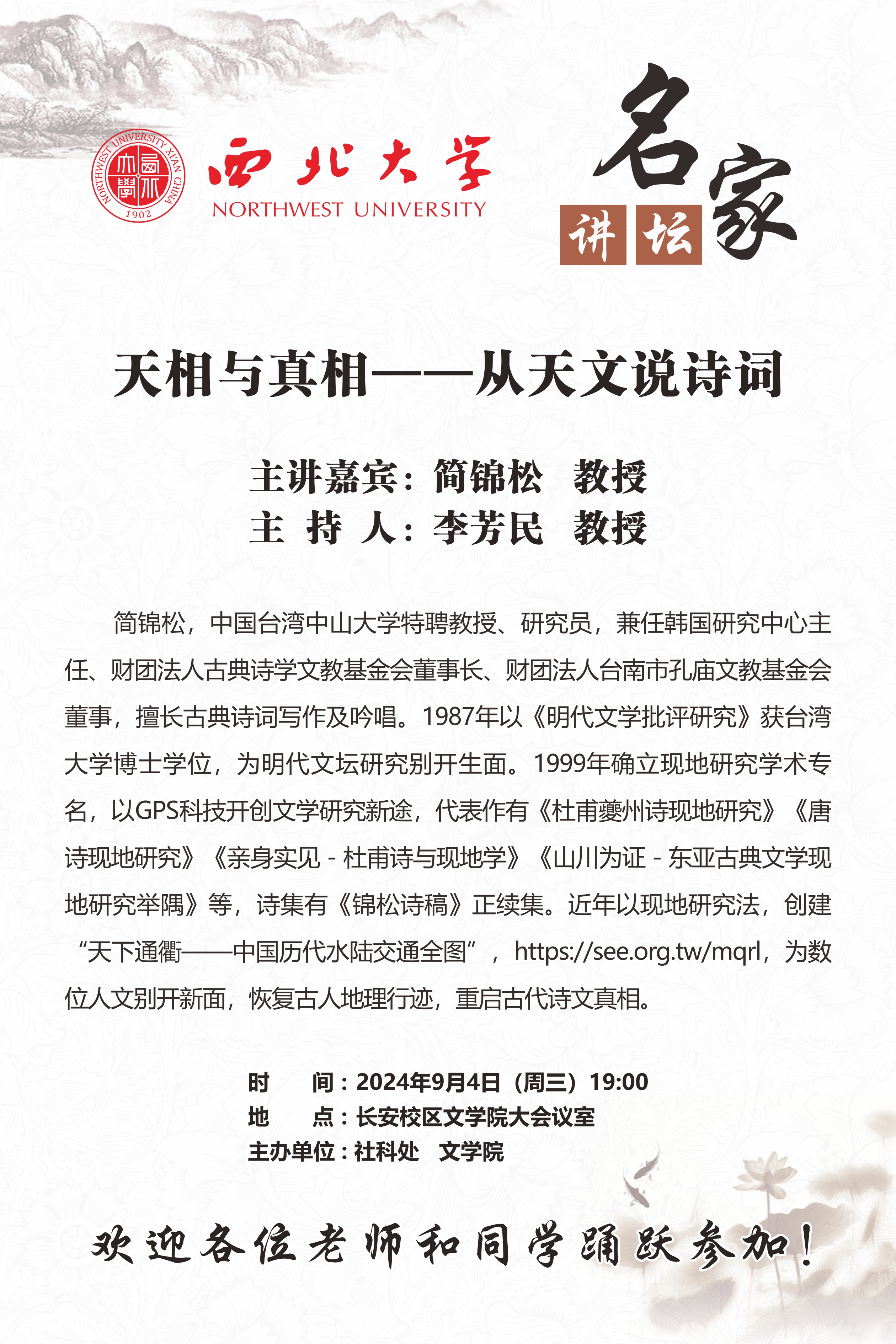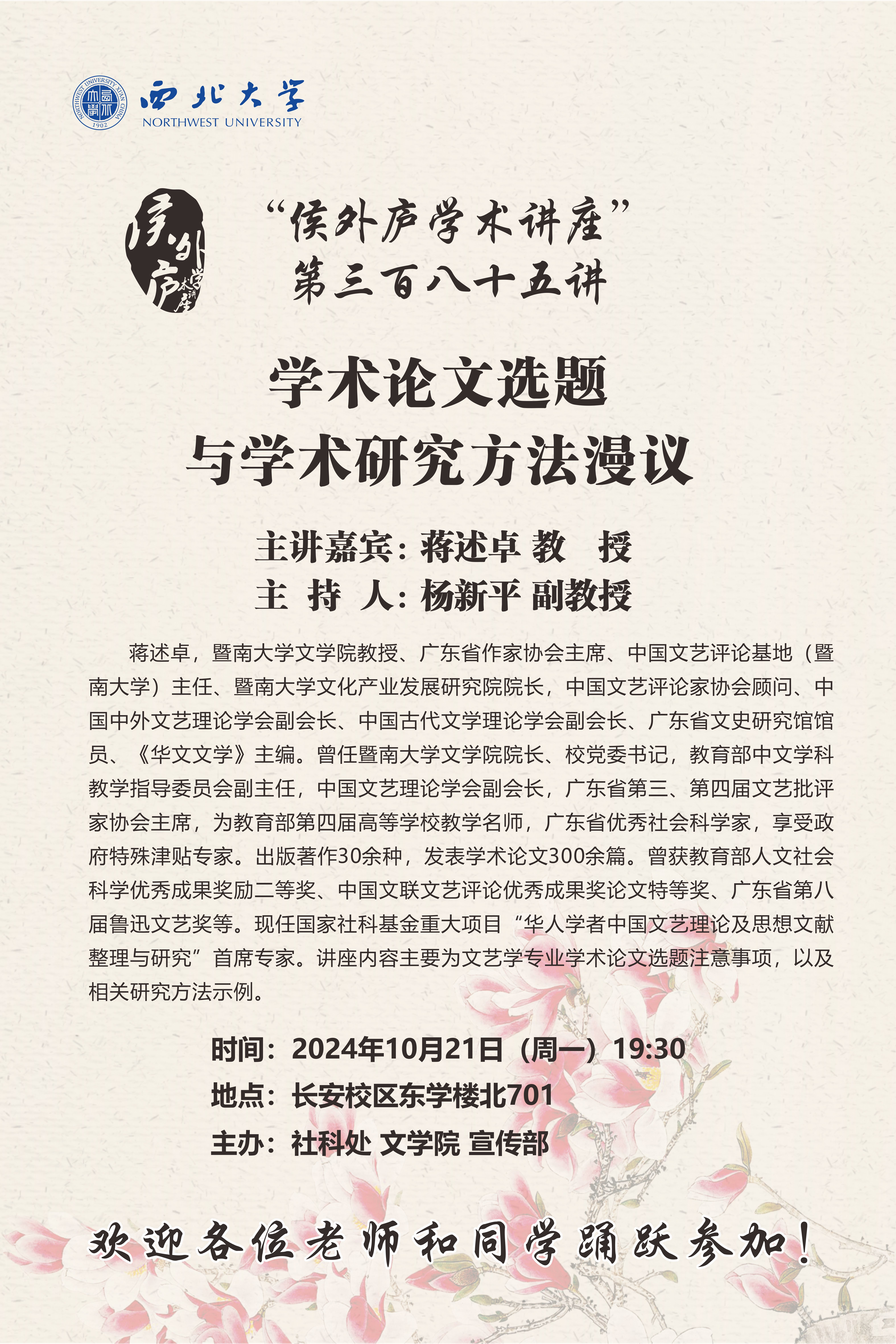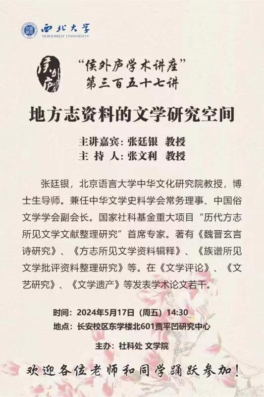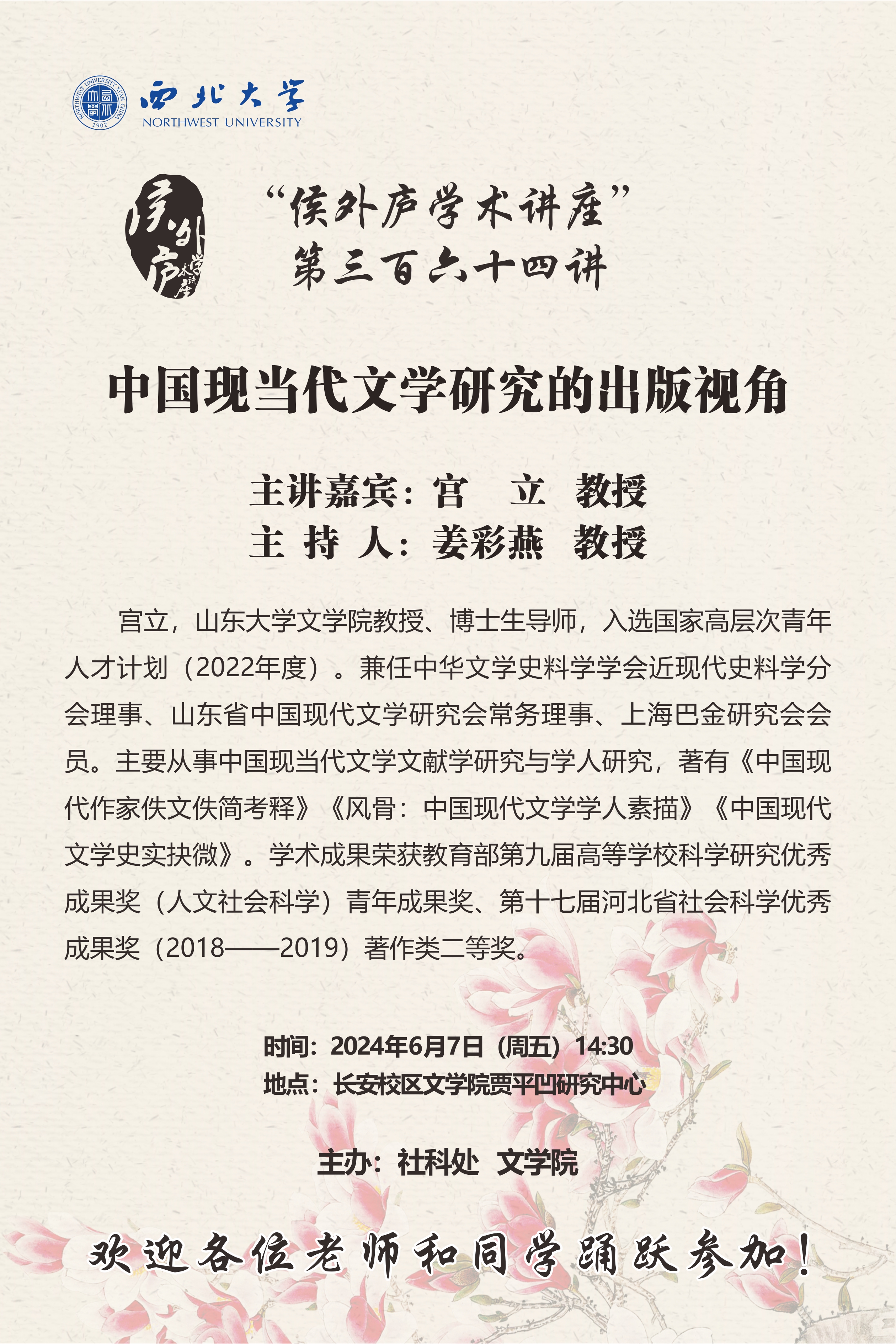 举办学术活动33次。主办“中国鲁迅研究会2024年年会暨纪念鲁迅西安讲学100周年国际学术研讨会”“历史图景·西部空间·民族影像:中国西部电影理论诞生40周年学术研讨会”“第二十届全国近代汉语学术研讨会”“贾平凹《河山传》学术研讨会”“76net必赢官网第三届古代文学、文献与文论工作坊”等学术会议5次;承办“侯外庐讲座”17次、“名家讲坛”8次,举办“锦熙讲座”暨“南山讲坛”3次。