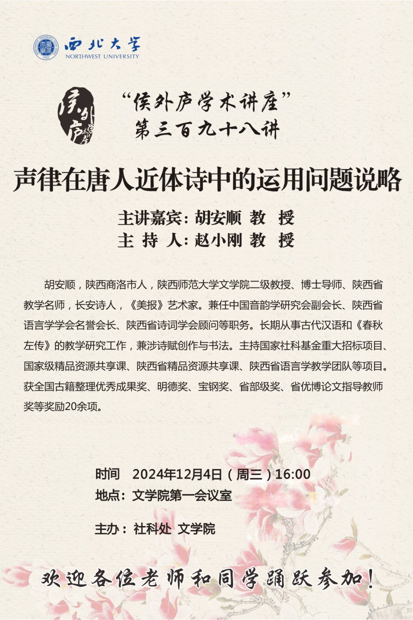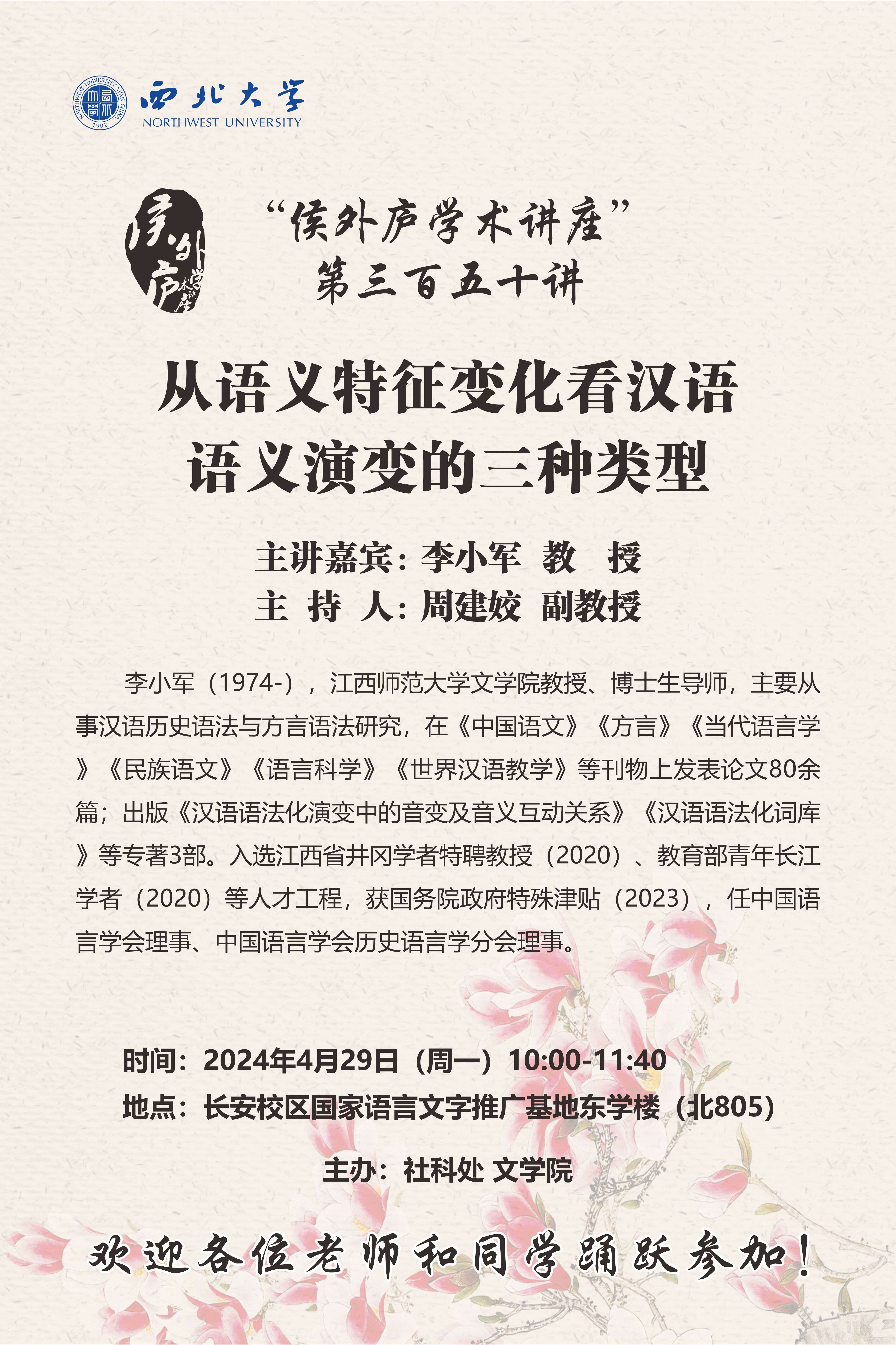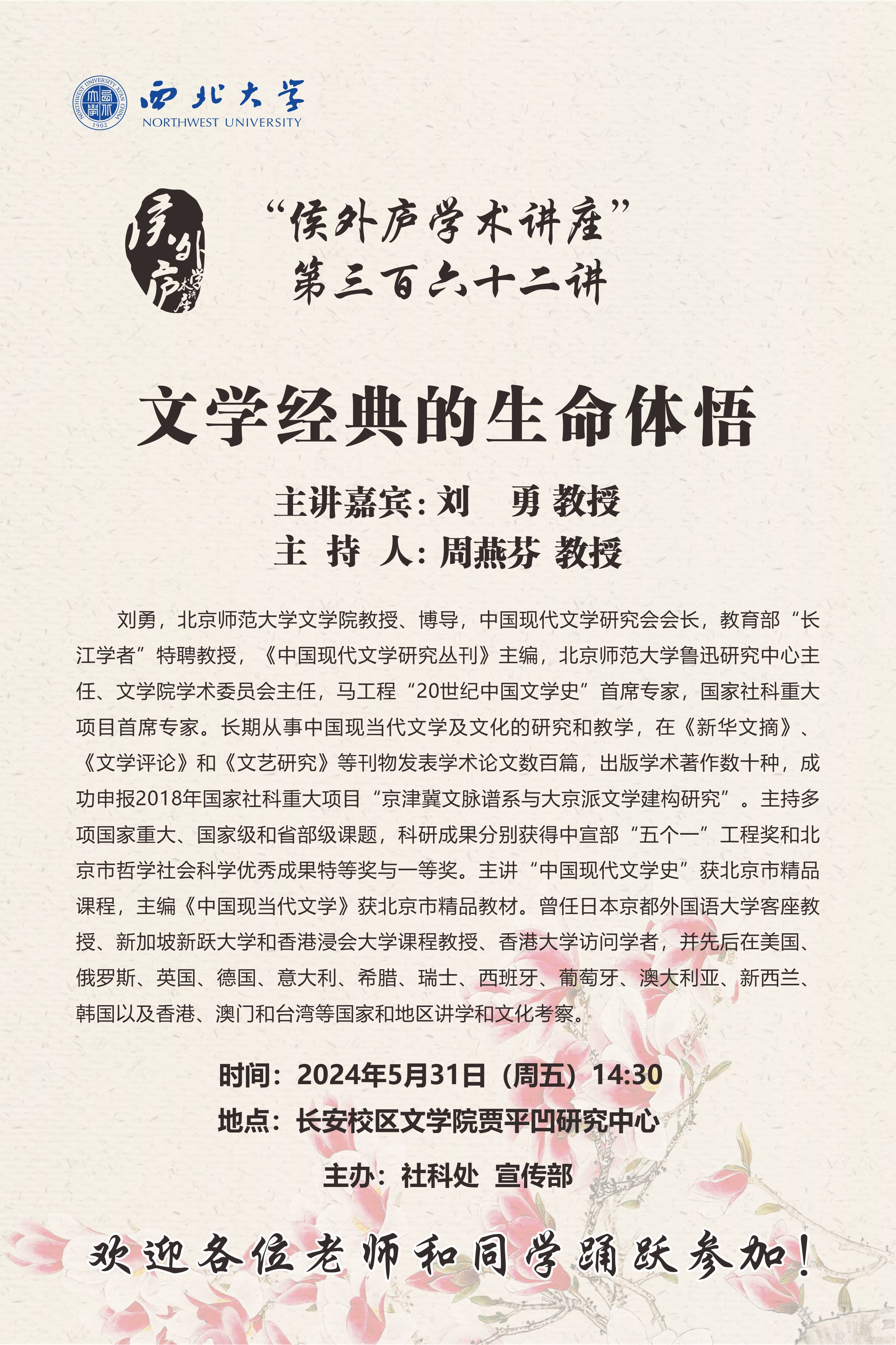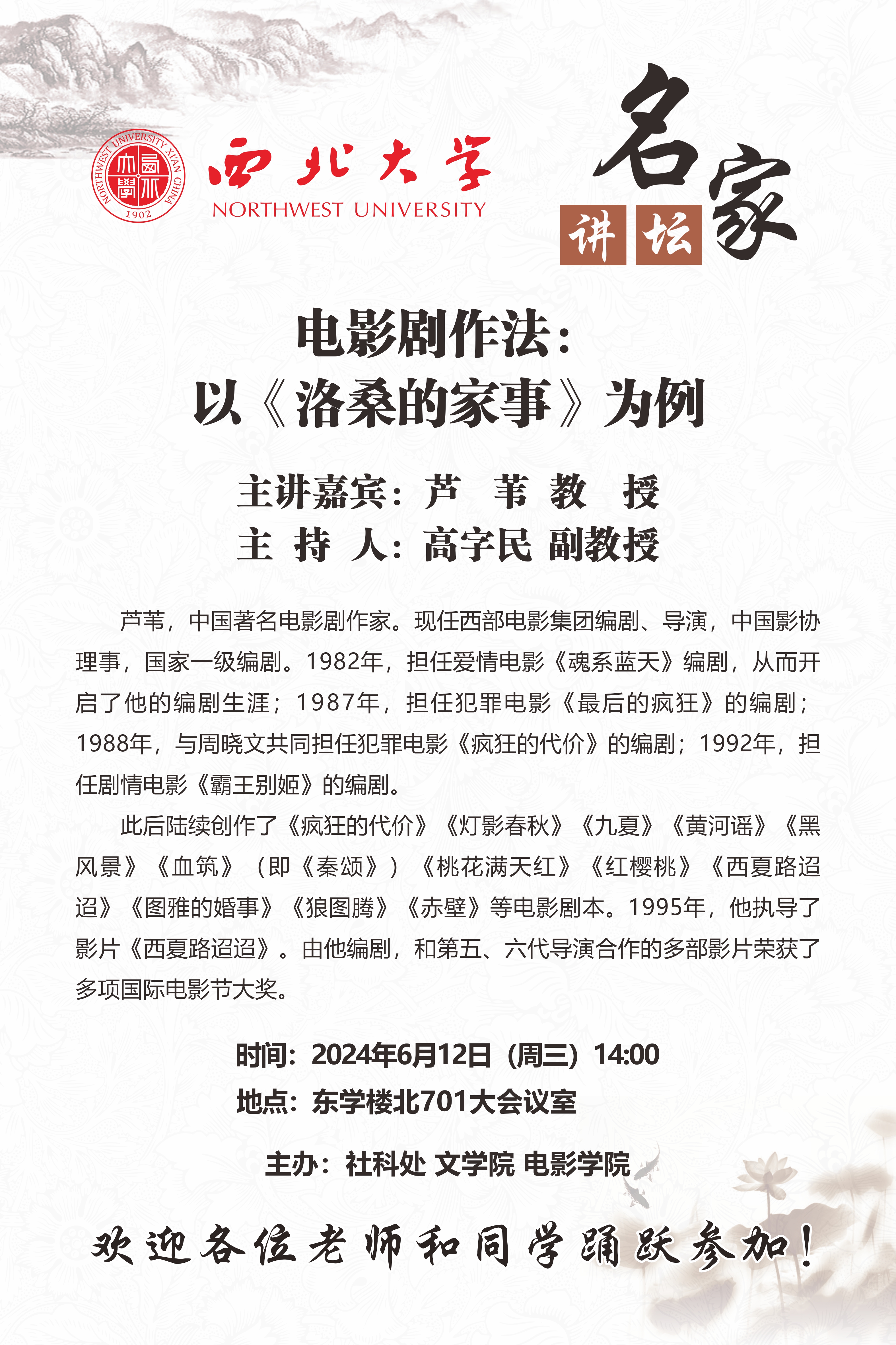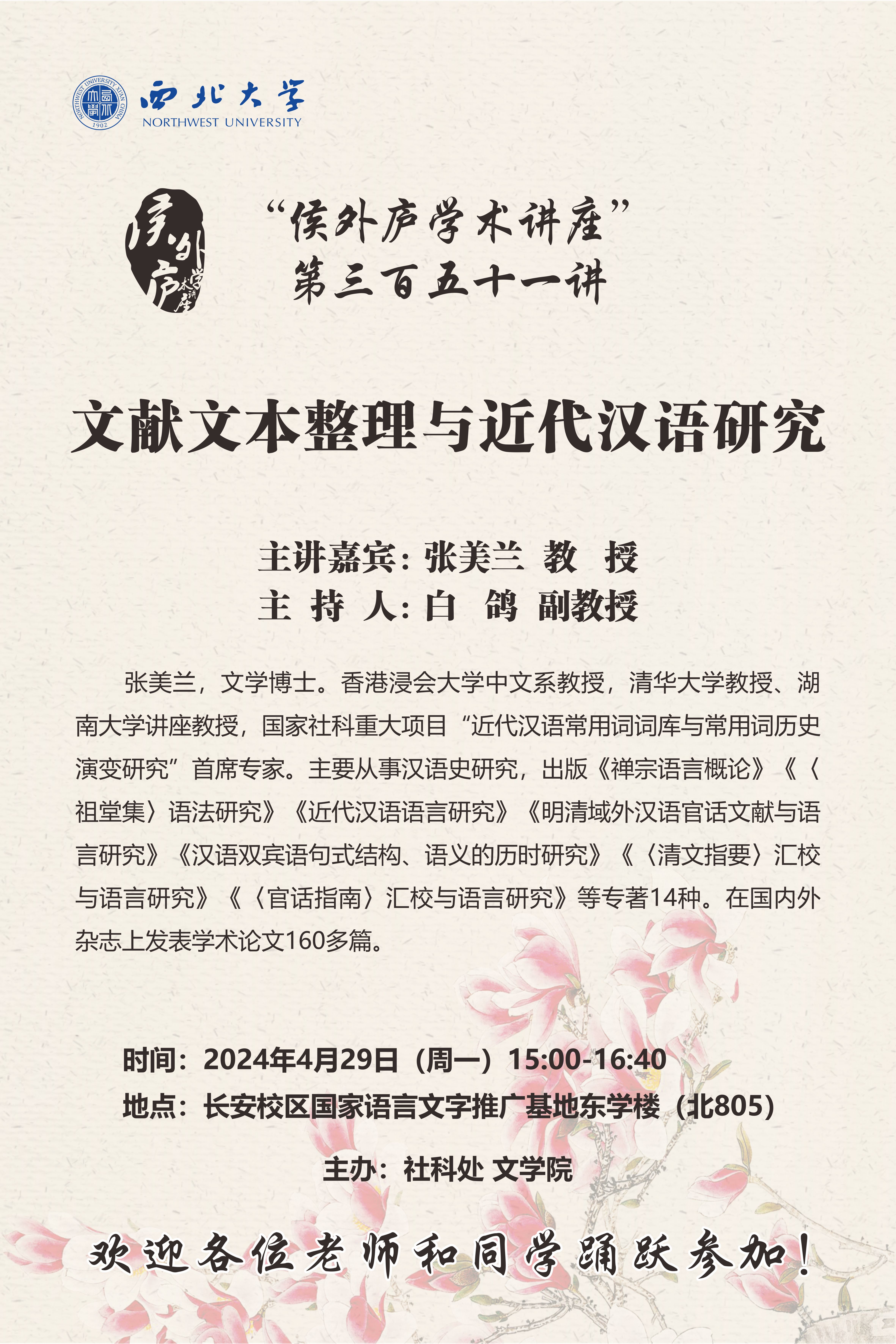 举办学术活动33次。主办“中国鲁迅研究会2024年年会暨纪念鲁迅西安讲学100周年国际学术研讨会”“历史图景·西部空间·民族影像:中国西部电影理论诞生40周年学术研讨会”“第二十届全国近代汉语学术研讨会”“贾平凹《河山传》学术研讨会”“76net必赢官网第三届古代文学、文献与文论工作坊”等学术会议5次;承办“侯外庐讲座”17次、“名家讲坛”8次,举办“锦熙讲座”暨“南山讲坛”3次。