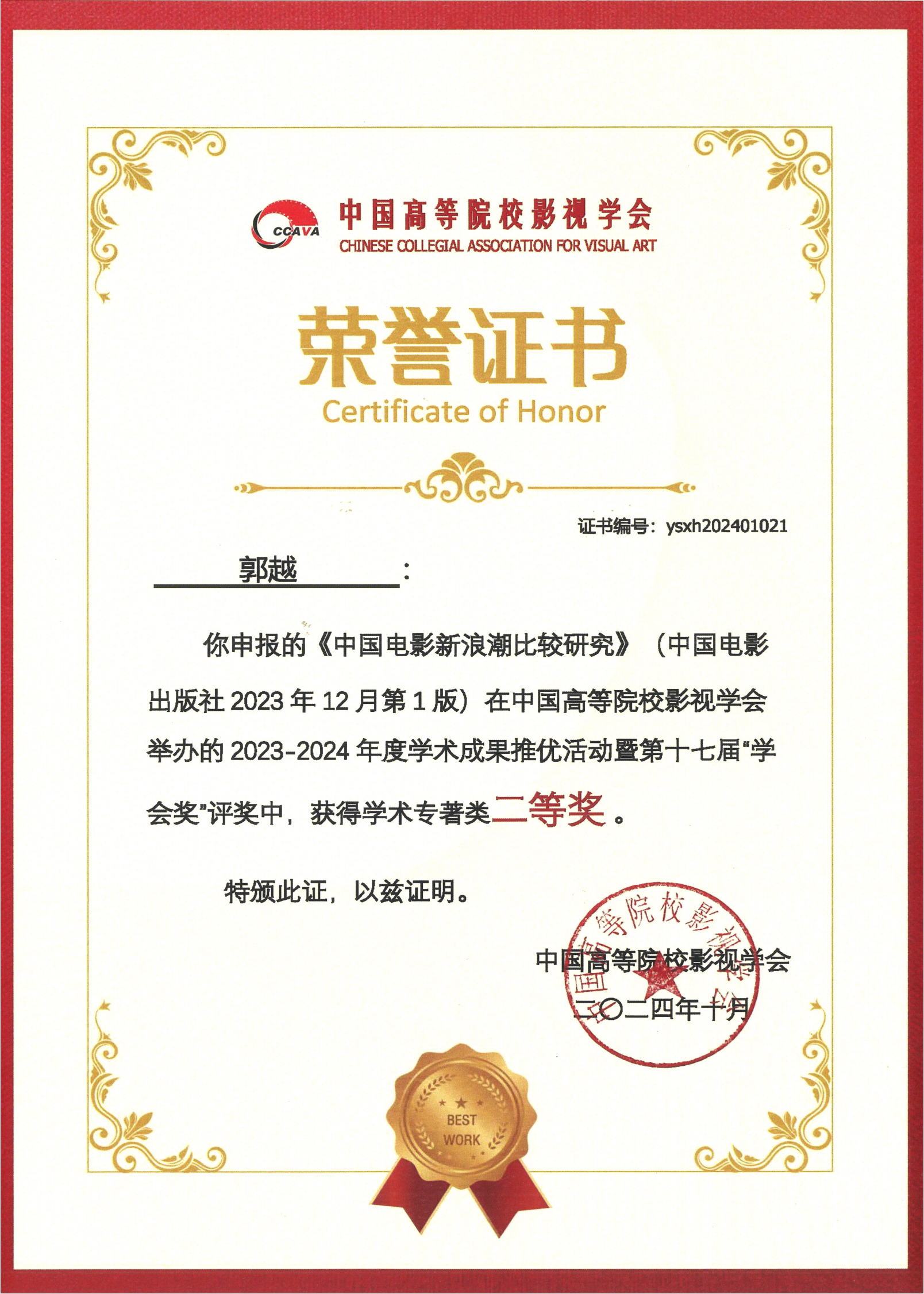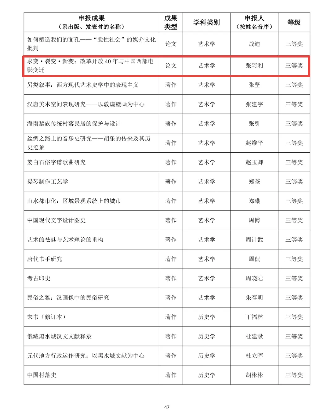 张阿利教授(第一作者)的《求变·裂变·新变:改革开放40年与中国西部电影变迁》获著作论文类三等奖。《求变·裂变·新变:改革开放40年与中国西部电影变迁》,发表于《现代传播》2019年第2期。文章系统梳理了中国西部电影的发展历程,结合时代语境与中国西部电影创作实践,探秘中国西部电影发展与改革精神的内在关联,对中国西部电影当下及未来创作提出期望与建议。