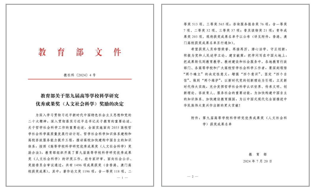 1、荣获教育部第九届高等学校科研优秀成果一等奖等奖项