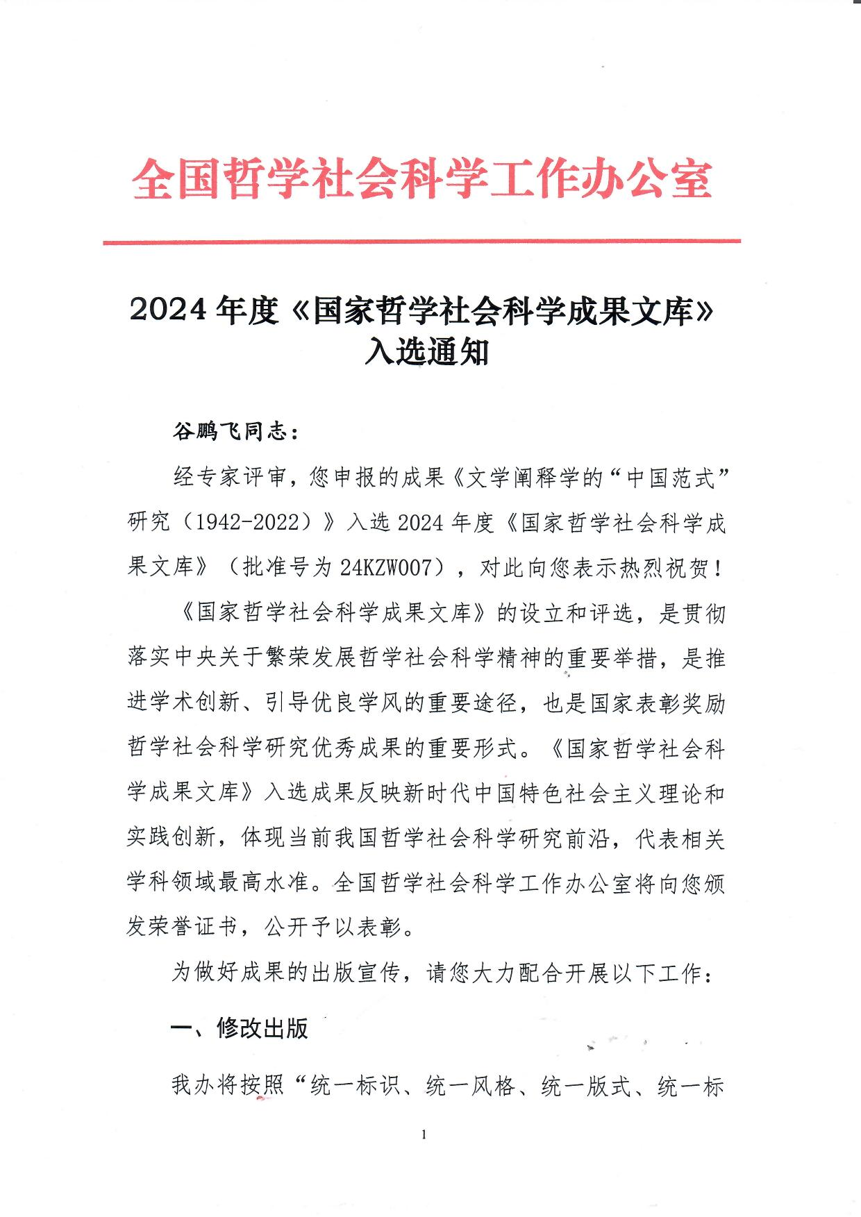 2、标志性成果入选谷鹏飞教授的《文学阐释学的“中国范式”(1942-2022)》入选《国家哲学社会科学成果文库》。
