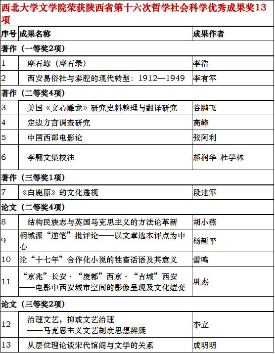 荣获陕西省第十六次哲学社会科学成果奖13项,包括一等奖2项,二等奖8项,三等奖3项。