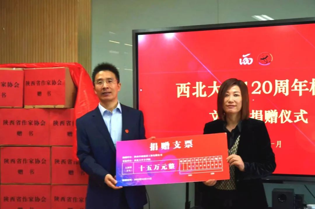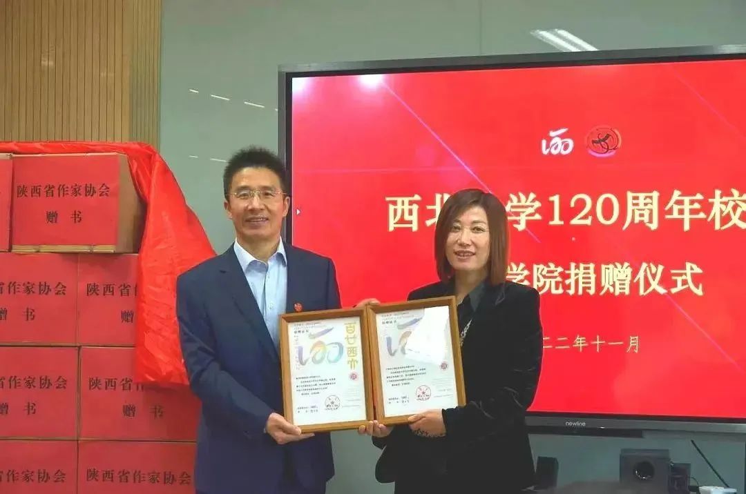 齐雅丽书记代表陕西省作协向我院捐赠陕西省名家经典及西北大学校友作家作品,共计57位作家、247册。这是陕西省作协为学校120周年校庆精心准备的珍贵礼物,表达对学校百廿岁月的崇高敬意和对西北大学的美好祝福。在捐赠仪式中,赵作纽副书记代表学校接受捐赠,与齐雅丽书记一同为捐赠图书揭幕,并向省作协颁发捐赠证书。学院将妥善保管这批珍贵图书,用于教学科研工作,努力使其释放出最大的育人效能。