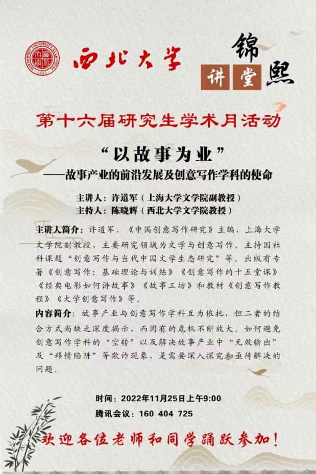 2022年11月25日上午9时,由必赢76net线路官网举办的“《中国创意写作研究》西北大学编辑中心”授牌仪式暨“以故事为业”学术报告活动以腾讯会议的线上方式顺利进行。此次报告系西北大学第十六届研究生学术月系列活动之一。活动由必赢76net线路官网陈晓辉教授主持,76net必赢官网副院长陈然兴副教授、创意写作教研室关峰副教授、苏岑博士、雷勇博士、安晓东博士,以及西北大学创意写作专业研究生、本科生以及部分慕名而来的校内外师生约两百余人参加了本次活动。