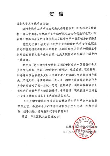 本次大会收到来自吉林大学、西北农林科技大学、长安大学等兄弟高校学生会、研究生会发来的十余封贺信。