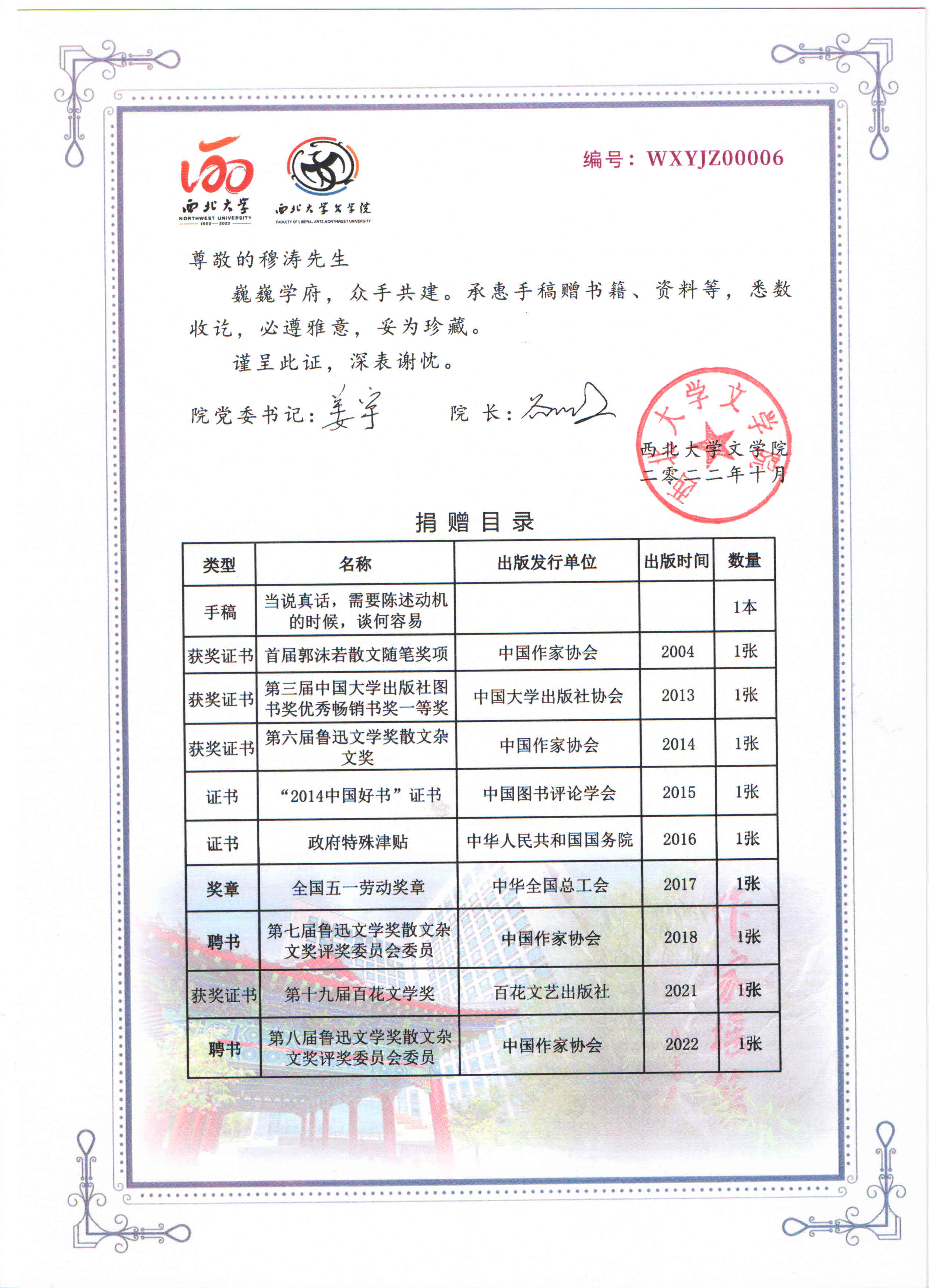 访谈行将结束时,穆涛深情祝福母校120周年华诞:“祝福母校!感恩母校!西北大学既是我们温暖的家,又永远是我们心中最神圣的殿堂。”并寄语后辈文学青年:“写文章,要说人话,不要说神话,除非你是老天爷。不要说鬼话,除非你是无常。也不要说官话,官话在官场中流通,文章中要清除掉。文章千古事,要冷静清醒着写文章。”最后,穆涛为师生签名赠书,惠赠长篇历史散文《当说真话需要陈述动机的时候》手稿原件。