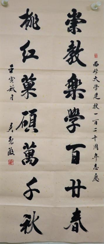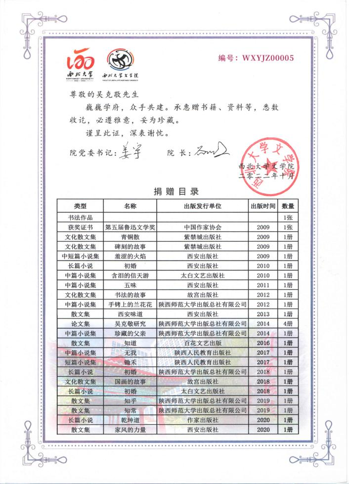 访谈结束前,吴克敬深情寄语学校和学子:“西大作为我的精神港湾,我常常回去,每去一次都有收获。在母校120年庆典到来之际,衷心祝愿西北大学120岁更加斑斓壮阔。我写了一副对联:‘崇教乐学百廿春,桃红果硕万千秋’,春秋在西北大学年轮上不断地刻画,未来还会有许多的120年。76net必赢官网被誉为“作家摇篮”,尤其在近几十年中出现了享誉国际和国内的大作家,比如贾平凹先生、迟子建女士等,未来76net必赢官网将继续为中国的文学事业添砖加瓦,培养更多优秀的文学人才。”访谈结束后,吴克敬为76net必赢官网师生签名赠书,并惠赠书法作品一幅和著作多种。
