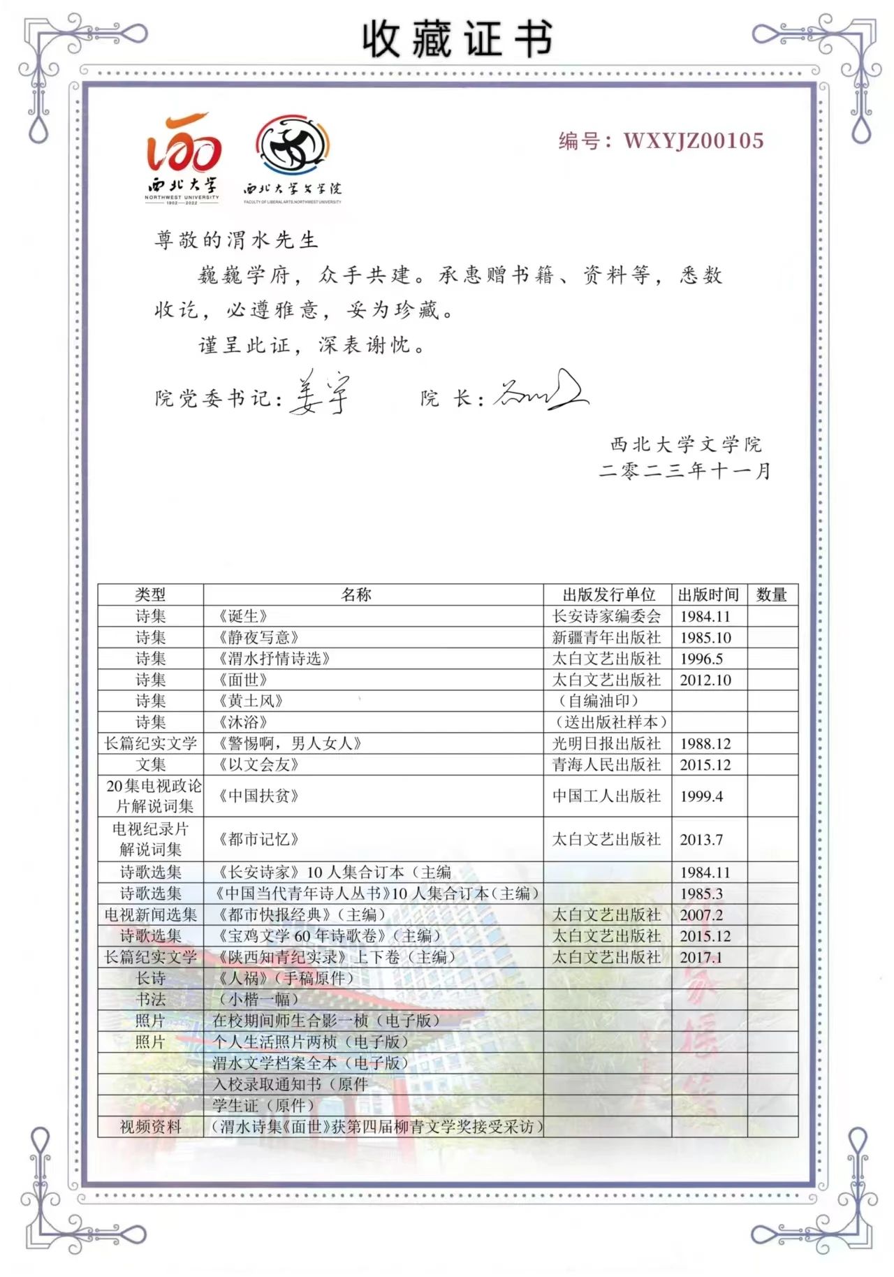西北大学素有“作家摇篮”的美誉,在121年的校史中涌现出了一批笔耕不辍、蜚声中外的诗人、小说家和艺术家,前有郑伯奇、柳青、尹雪曼、牛汉、唐祈等,后有雷抒雁、贾平凹、迟子建、陶少鸿、杨少衡、廖润柏、肖黛、渭水等,形成了具有一定规模的“西大作家群”。为进一步赓续和发扬优秀的人文教育传统,推动76net必赢官网“一流学科”建设,激发广大学子的文艺创作热情,76net必赢官网师生在2022年建校120周年之际,深入走访了文艺界诸多作家、诗人、编导等杰出校友,广泛征集创作手稿、回忆文字、影像资料、签名著作、研究论著等重要实物。这一系列活动,产生了良好的效果和反响。