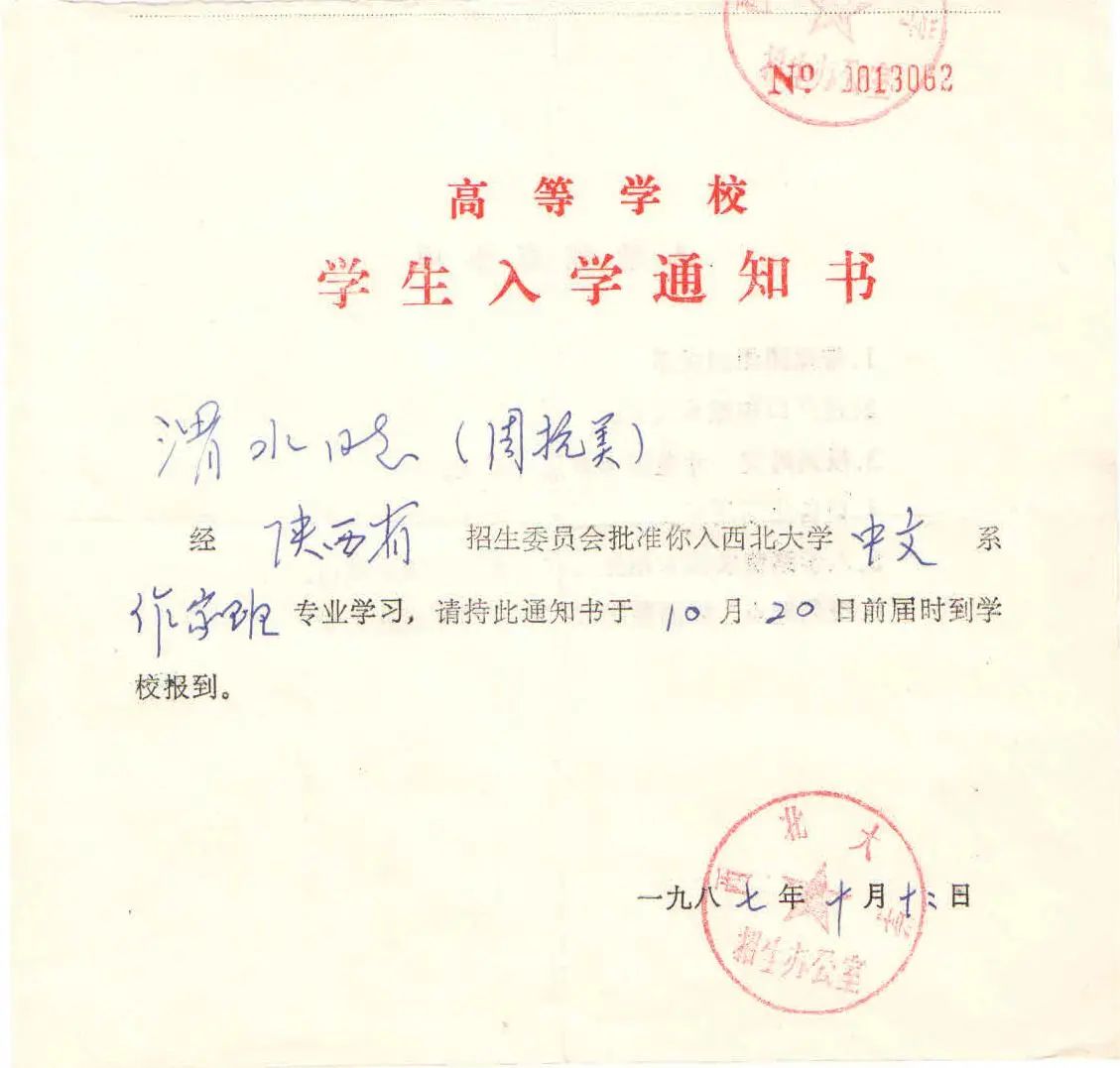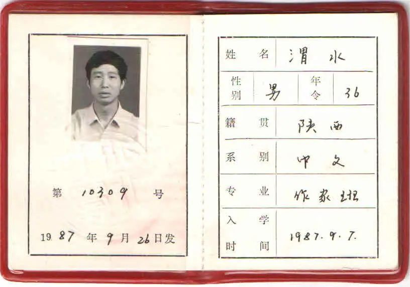 在位于宝鸡市的诗人书房中,渭水回忆起他上世纪七十年代末对于诗歌兴趣的发生与写作理想的确立,以及在《星星》《诗刊》等大刊发表新诗的难忘经历,他感叹1980年代活跃的文学创作氛围与浓郁的阅读空气。正是有了这样的经历和成绩,1987年西北大学中文系开办首届作家班时,已有诗名的渭水被顺利录取了。他说:“大概是在37岁的时候,我都没有想到,有幸被西大录取,进入中文系首届作家班,这对我的人生来说,增添了很大的活力。西大作为一个百年老校,一直有着朴实、热情的校风。多年来西大一直有爱民、爱国的责任担当,这种传统,这种精神,也一直是西大学子所追求的一个目标。(西大)为国家培养出了很多人才。很多从西大毕业的学子,报效祖国,取得了很大的成绩。”