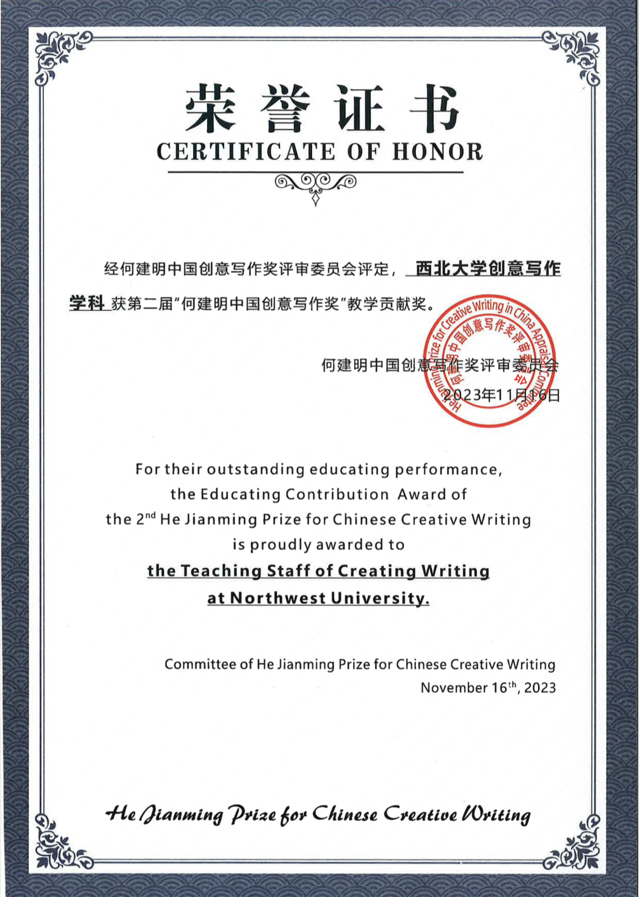 我院创意写作学科与上海大学创意写作学科同时获得“何建明中国创意写作奖”教学贡献奖,获奖理由为:
