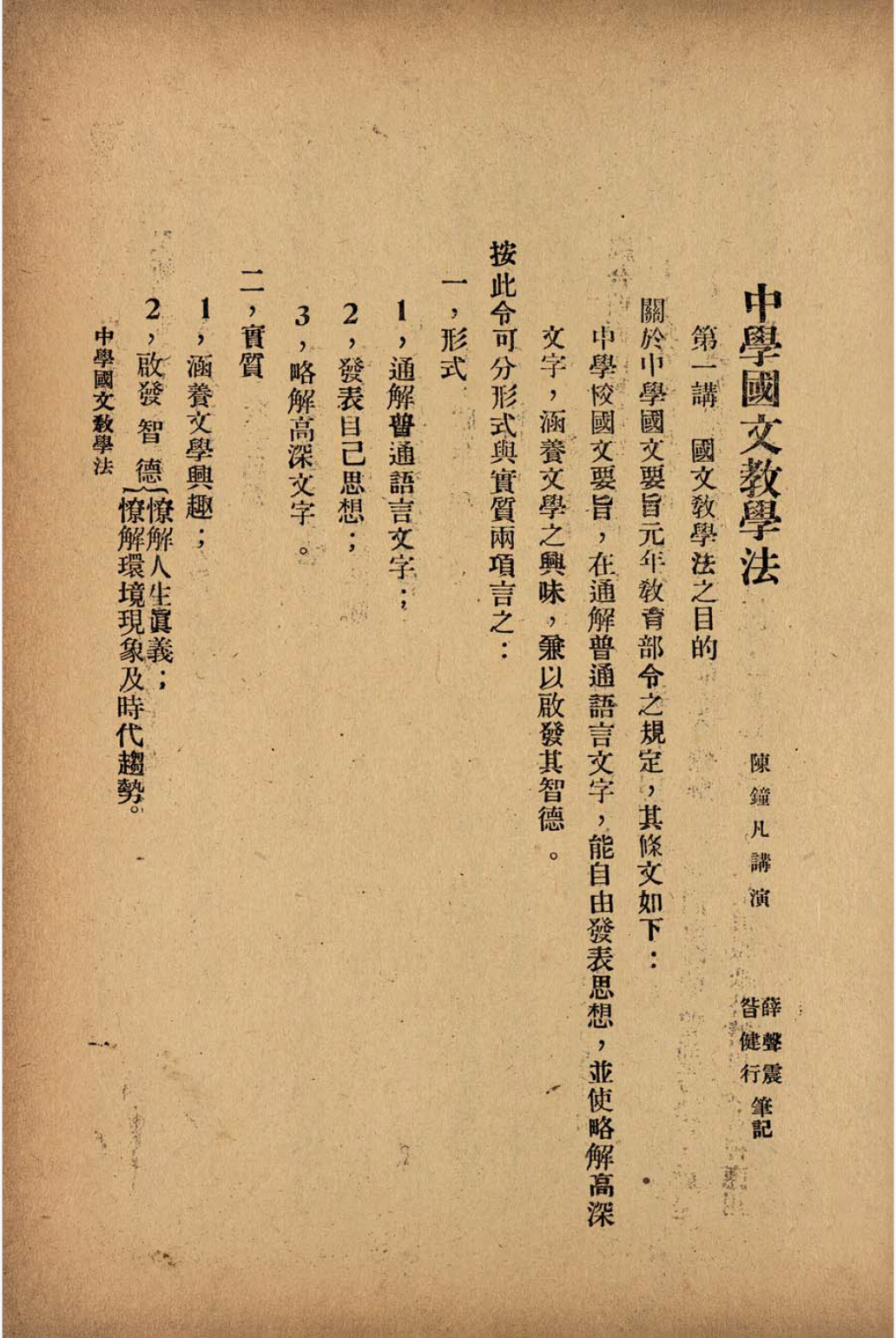 《中学国文教学法》 陈钟凡讲演;薛声震、咎健行笔记