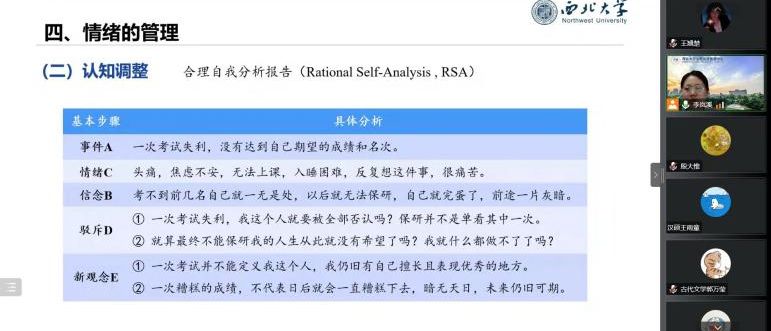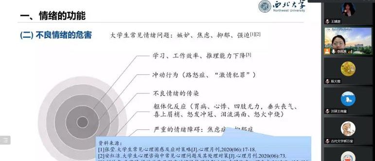 讲座围绕情绪的功能、情绪的定义、情绪的识别、情绪的管理四个方面展开,重点介绍了情绪是什么、如何合理调适自己的情绪等内容,旨在提升同学们对情绪的认识及管理能力,普及情绪的定义、基本功能、产生机制及调适方式。