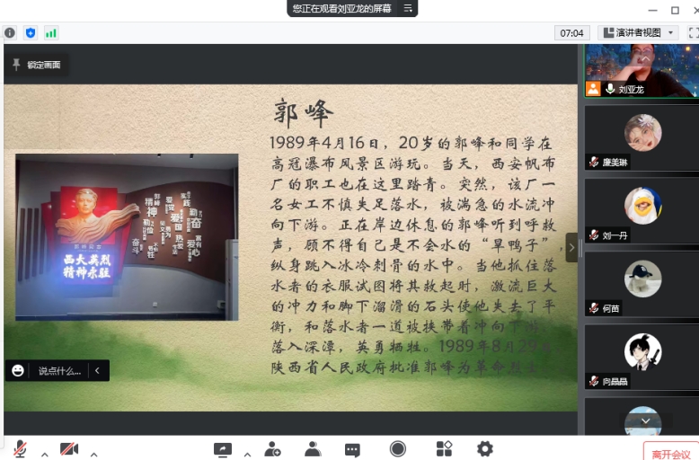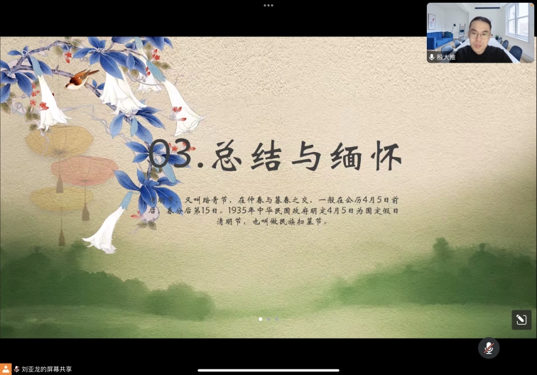 为深入学习贯彻党的二十大精神及习近平总书记关于用好红色资源、赓续红色血脉的系列重要论述精神,4月4日,我院组织学生线上开展“我们的节日”——清明节主题教育活动,引导青年学子回望历史、缅怀英烈。本次活动由刘亚龙主持。