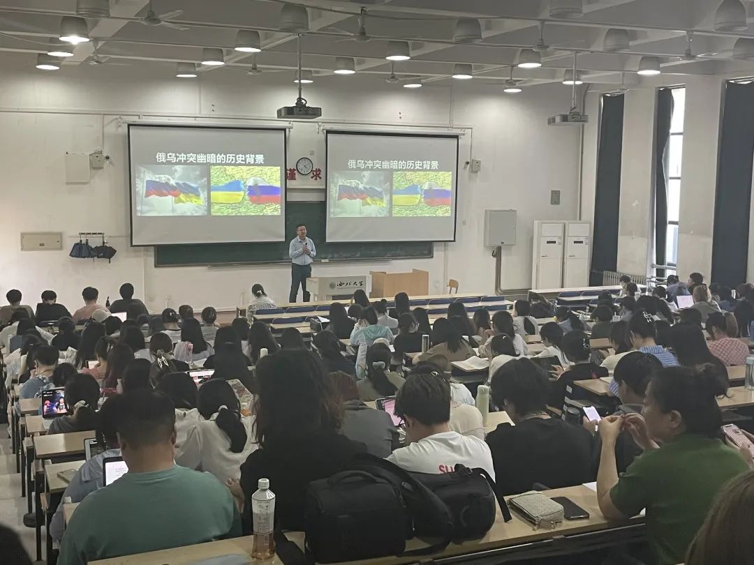 周超老师首先从冲突双方、持续时间等方面大概介绍了目前俄乌冲突的基本情况,带领同学们回顾了俄乌冲突的发展过程。随后从深层次分析了此次俄乌冲突的多重原因和历史背景,并从政治、经济、外交、军事等方面全面讲解了俄乌冲突对世界格局的影响以及中国的应对策略和对中国发展的启示。最后,周超老师寄语同学们,作为新时代的大学生,要在日常学习生活中始终保持政治清醒,牢固树立总体国家安全观,自觉抵制危害国家安全的言论、行为,为实现中华民族伟大复兴的中国梦贡献青春力量。