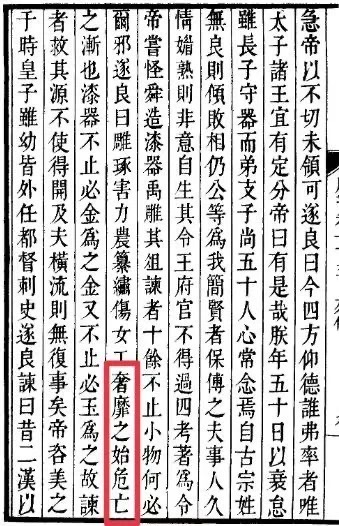 “奢靡之始,危亡之渐”,出自北宋欧阳修等编撰的《新唐书》卷一〇五《褚遂良传》。文载: