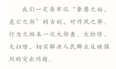 广大党员干部要认真学习领会、深入贯彻落实习近平总书记重要讲话精神,牢记“奢靡之始,危亡之渐”的古训,懂得清廉是福、贪欲是祸的道理,时刻警醒自己,坚决抵制享乐主义、奢靡之风,永葆共产党人清正廉洁的政治本色,以优良的作风振奋精神、激发斗志、树立形象、赢得民心。
