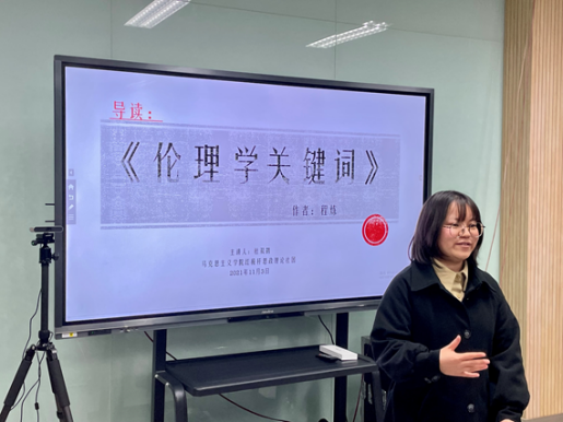 来自马克思主义学院的杜双鹤同学分享了《伦理学关键词》一书,本书分为三个部分:规范伦理学、元伦理学和应用伦理学,论述了伦理学中的十八个关键词,每一个关键词,按照统一体例,由“关键视窗”、“关键视点”和“关键著作”三个小节构成,以反映当代伦理学的成就。杜双鹤同学着重分享了规范伦理学的基本范畴,包括利己主义与利他主义、自然法、契约主义、功利主义、义务论、美德等概念,提出怎样才能使一行为具有价值,应该做出怎样有意义的行为,什么样的人生才是值得过的三个问题并展开分享。为了更好地解读书中的内容,杜双鹤同学通过当下互联网上较有争议的同人文案例讨论了创作同人文的道德原则问题。杜双鹤同学呼吁同学们不要轻视任何一力量,实现有价值的人生。
