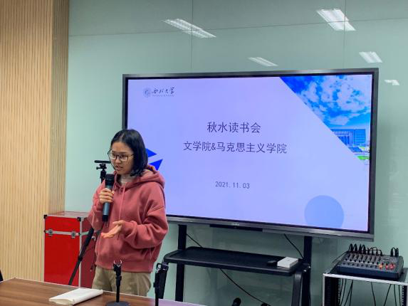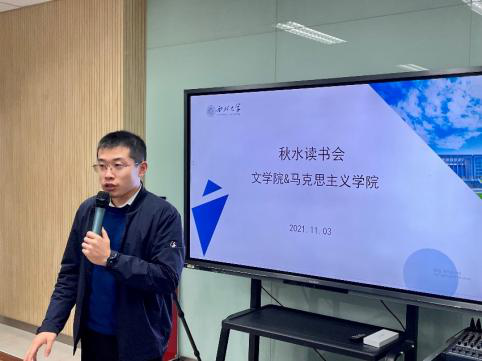 为深入学习贯彻习近平总书记来陕考察重要讲话重要指示精神,落实省委教育工委《关于深化党史学习教育的通知》及校党委《关于认真学习宣传贯彻习近平总书记来陕考察重要讲话重要指示的通知》要求,11月3日晚,我院与马克思主义学院在长安校区东学楼七层第一会议室举办了2021-2022学年第二期秋水读书会。本次读书会围绕“马克思主义与中国文学”这一主题展开分享,力图通过读书会的形式落实文件精神,巩固党史学习教育第一阶段学习成果。我院辅导员李钰莹,马克思主义学院博士研究生、西北大学党史学习教育宣讲团成员、青年讲师团特聘讲师黄翌作为特邀嘉宾出席本次活动。