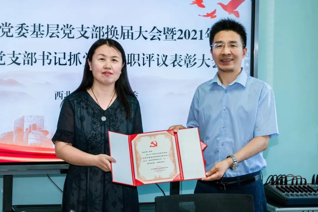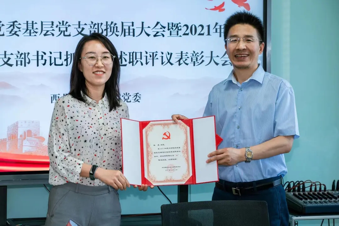 会上,姜宇同志宣读了2021年度基层党支部书记抓党建述职评议表彰决定。院长、党委副书记谷鹏飞同志、党委副书记陈柯同志为上年度评议考核等次为“好”的教工第一党支部书记姜彩燕、教工第四党支部书记张昊、2020级硕博党支部书记杨萌、2019级硕博党支部书记安小兰颁发荣誉证书。