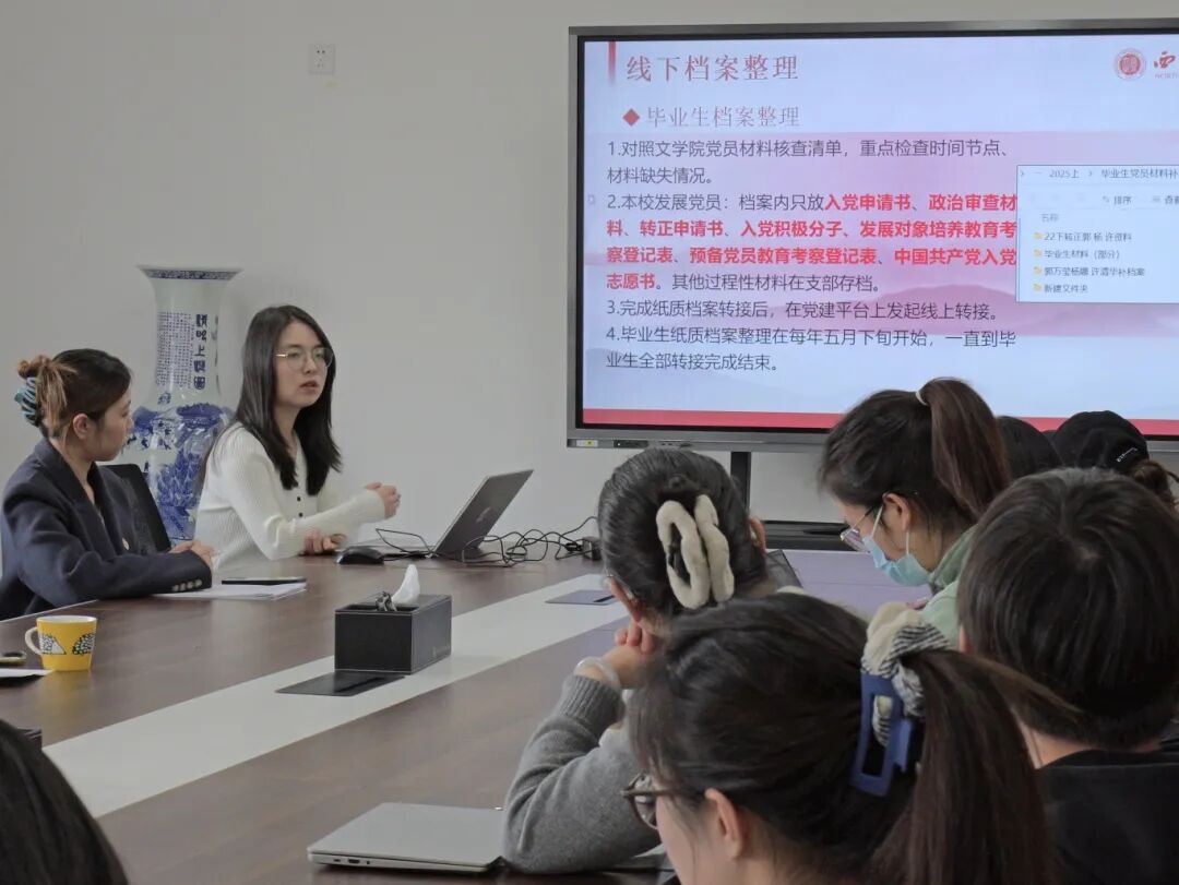 76net必赢官网古典文学与文献学生党支部书记朱怡围绕“党员档案整理与分类归档”开展专题培训。她结合工作实践与其他院系先进经验,对档案线上线下整理、重要材料填写规范等内容做了详细说明,具有实用性与指导性,帮助学生党员干部进一步理清档案整理思路、掌握填写方法。