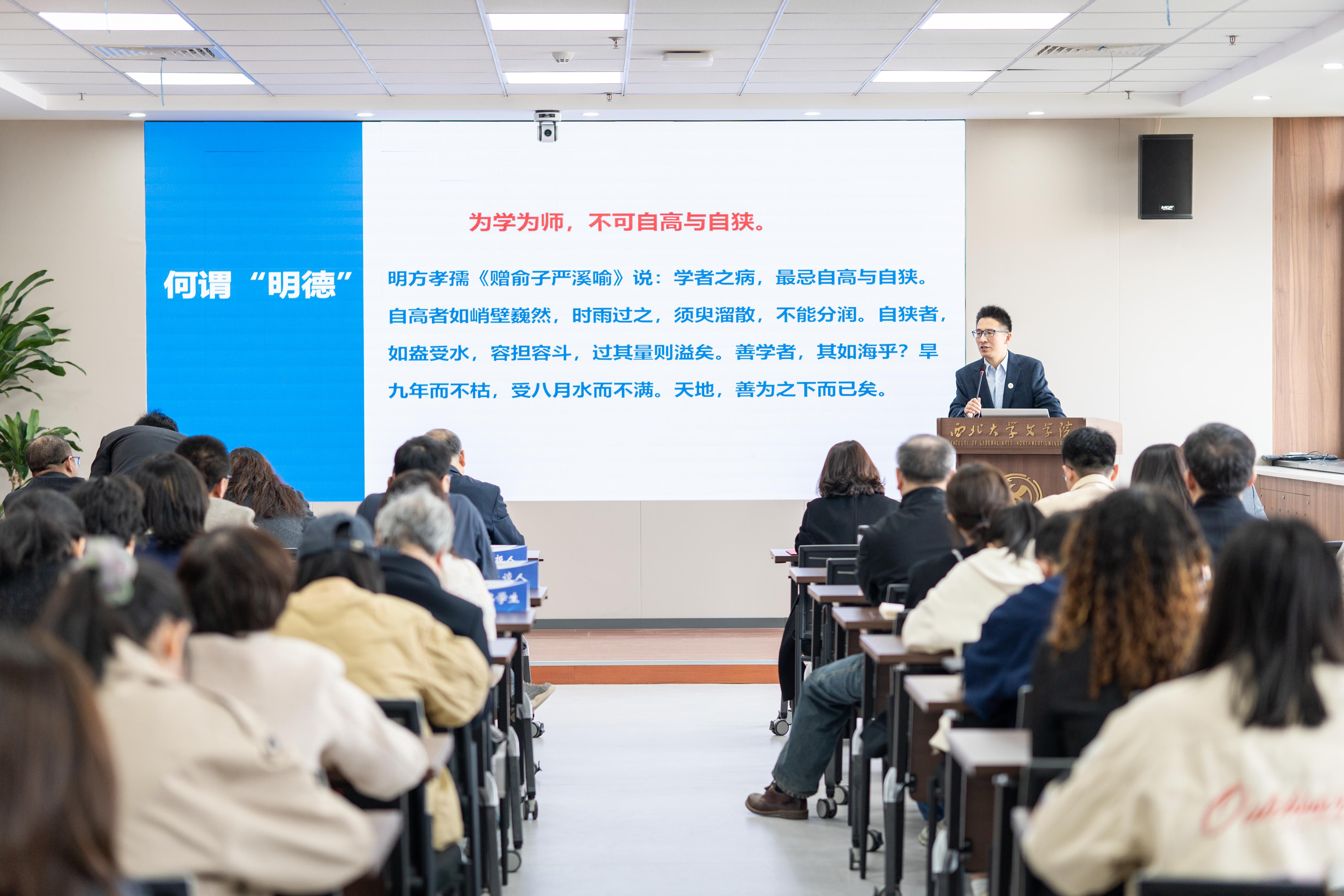 年会第二阶段,首先进行了“76net必赢官网第二届师德大讲堂”。校党委教师工作部部长惠正强、校党委研究生工作部部长李伟参加了活动。主讲人谷鹏飞教授结合自己的治学经验和新时代大学教育及学术导向,从“为学为师,不可自高与自狭”“只有时代的学问,没有学者的学问”“创造性诠释学与学术研究的创新”三个观点出发,阐述了“明德正学”的当代内涵,呼吁广大教师以“教育家精神”以文化人、立德树人,以“科学家精神”求学问道,做真学问、大学问。